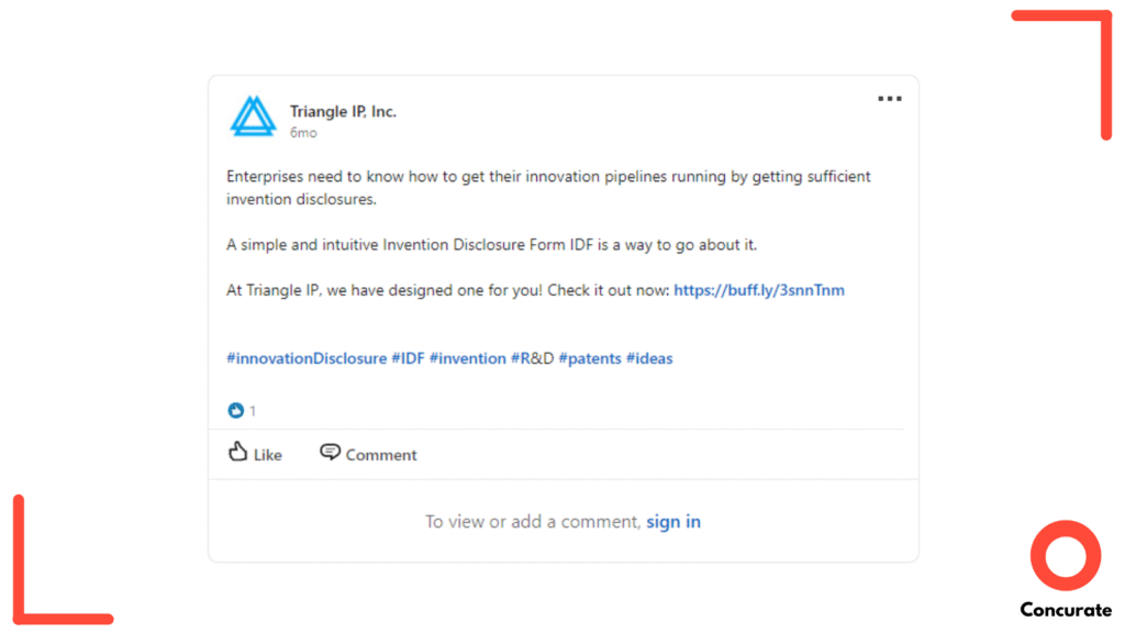 Concurate follows the approach of Attract, Retain, Capture and Convert while ideation and creating content pieces. This approach dictates how the content gets promoted through different channels. This example comes from our client, Triangle IP. The TIP Tool by Triangle IP is an intuitive drag and drop tool that helps you manage the end-to-end IP lifecycle from ideas to patents. The vision behind TIP Tool’s creation is the democratisation of patents. Usually, the patent process is not transparent, and many organisations do not have enterprise-wide innovation capture systems and processes. The TIP tool is here to change that.