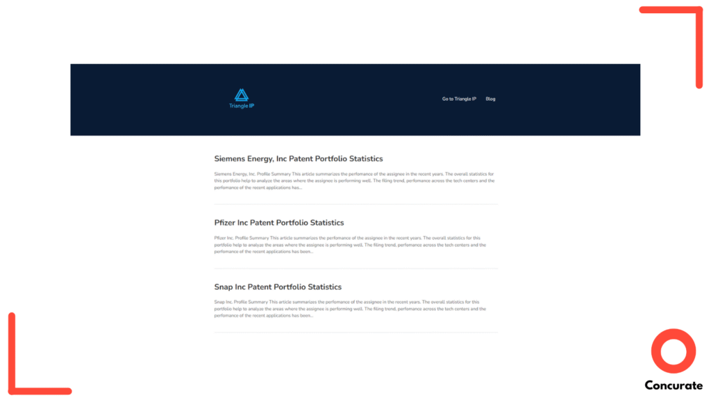 At Concurate, we attempt to create scalable content. Scalability means that after expending initial efforts to develop scripts and templates, we publish content that enhances our clients’ expertise, authority and trustworthiness. For example, we created multiple “patent portfolio statistics” content pieces for our client, Triangle IP.