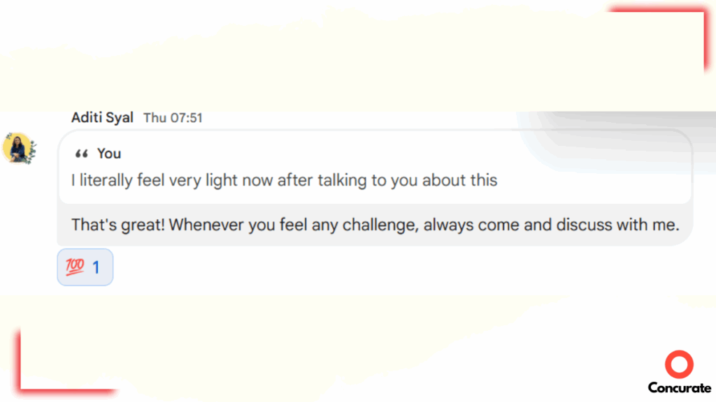 At first, I was focused only on survival. Just meeting deadlines, just fixing what the reviews pointed out. Going beyond felt impossible when I was still learning the basics. But Concurate’s culture expects more: new ideas, systems, contributions that raise the bar. It took time, but slowly I learnt that growth isn’t just about meeting expectations. It’s about stepping beyond them.