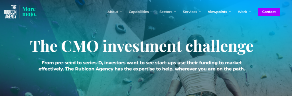 Rather than focusing on channel execution or short-term acquisition, the site highlights relevance, earned media, thought leadership, and narrative clarity as primary growth levers.