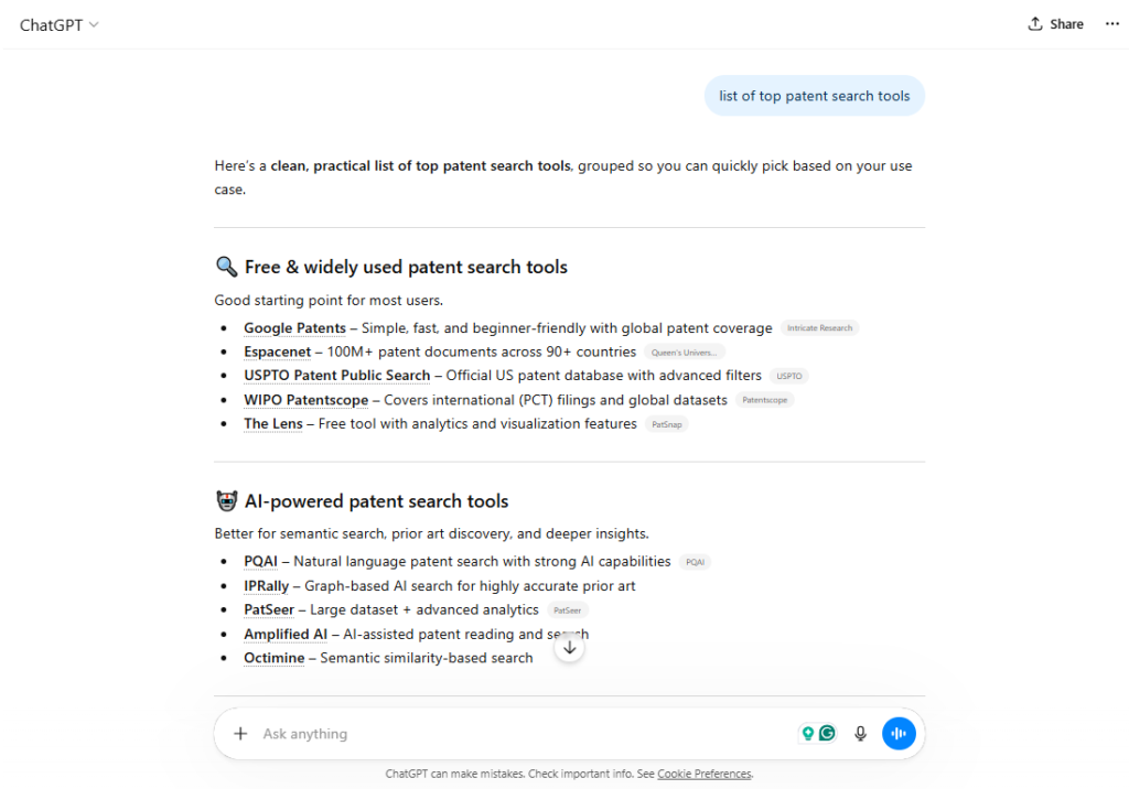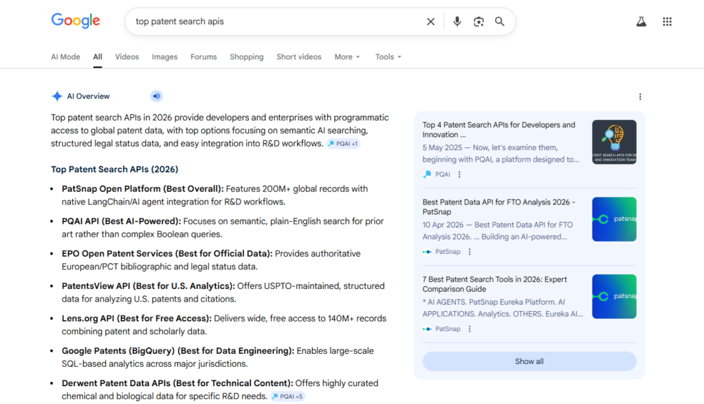 The result? Today, when anyone searches for keywords like “top patent search tools” or “top patent search APIs” on ChatGPT, Perplexity, or any other AI, our client consistently appears in the answers.