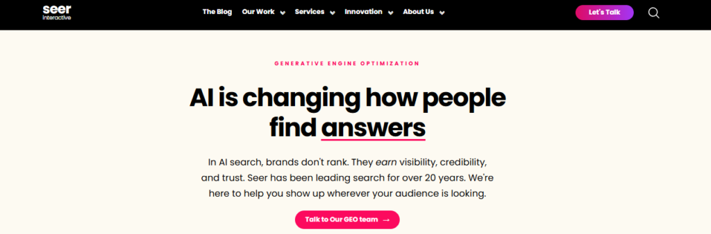 Seer Interactive is a digital marketing agency that combines SEO, paid media, and analytics. They rely heavily on testing to guide their GEO work.